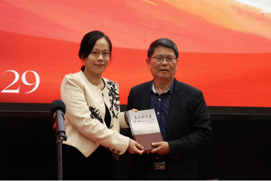 演出过程中,校关工委主任陈封椿应邀登台讲党课,在篇章间歇深情讲述了抗日战争时期文昌南阳人民的英雄事迹,以及琼崖革命武装斗争二十三年红旗不倒的壮阔史诗。鲜活的历史细节与真挚的情感流露,让现场师生深切感受到海南人民不屈不挠的抗战精神。陈封椿还向今朝书院赠送了《春风吹又生》一书,期望以文字传承红色力量,让抗战精神与家国情怀生生不息。